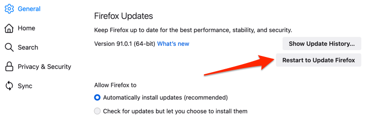 For Firefox, open the browser’s Settings > General, go to the “Firefox Updates” section, and select Check for updates. If Firefox already downloaded an update in the background, select Restart to Update Firefox to install the update.