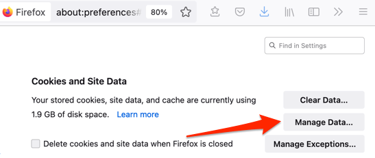 - Scroll to the “Cookies and Site Data” section and select Manage Data.