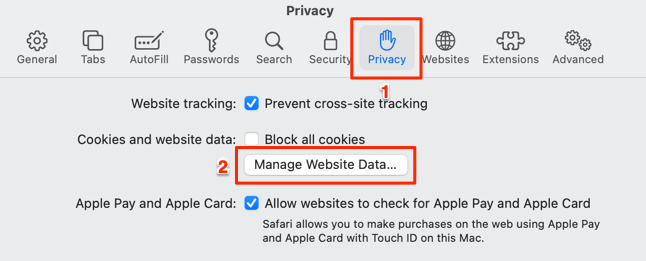 Launch Safari, select Safari on the menu bar, select Preferences, head to the Privacy tab, and select Manage Website Data.