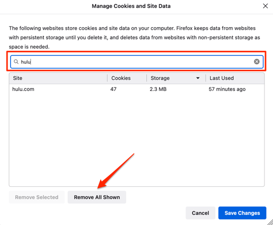 For Hulu users who encounter this error code RUNUNK13 on Firefox, clear the streaming service’s cookies and site data following the steps below.