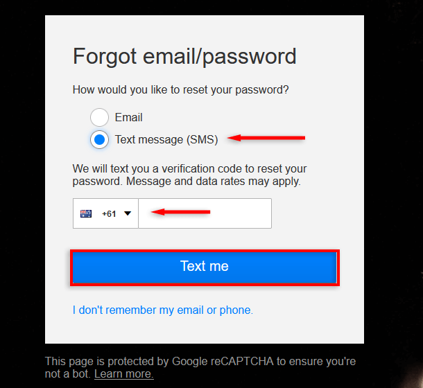 - Click Text Message (SMS) then enter your phone number and select Text Me.