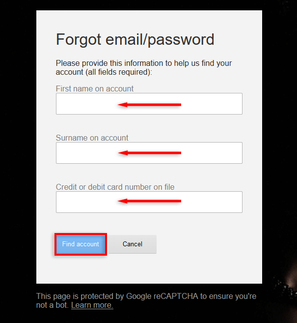 - Type your first and last name and the credit/debit card number used on your account, then select Find Account.