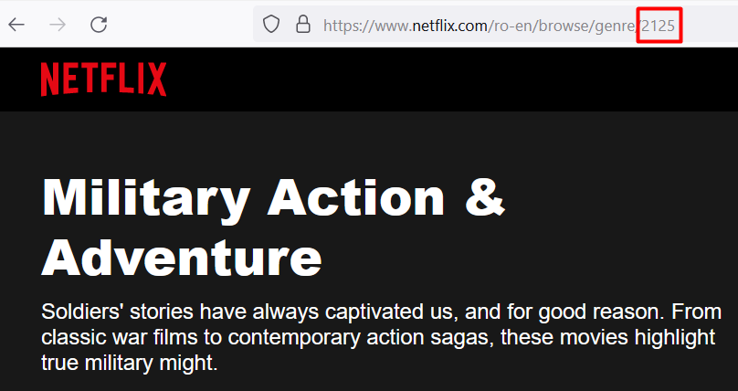 3. Type https://www.netflix.com/ro-en/browse/genre/secretcode into your web browser’s address bar and replace “secretcode” with an actual code from the list below and press Enter. For example, code 2125 will send you to the Military Action & Adventure category. Netflix will now recommend to you all the movies and TV shows tagged in this genre.