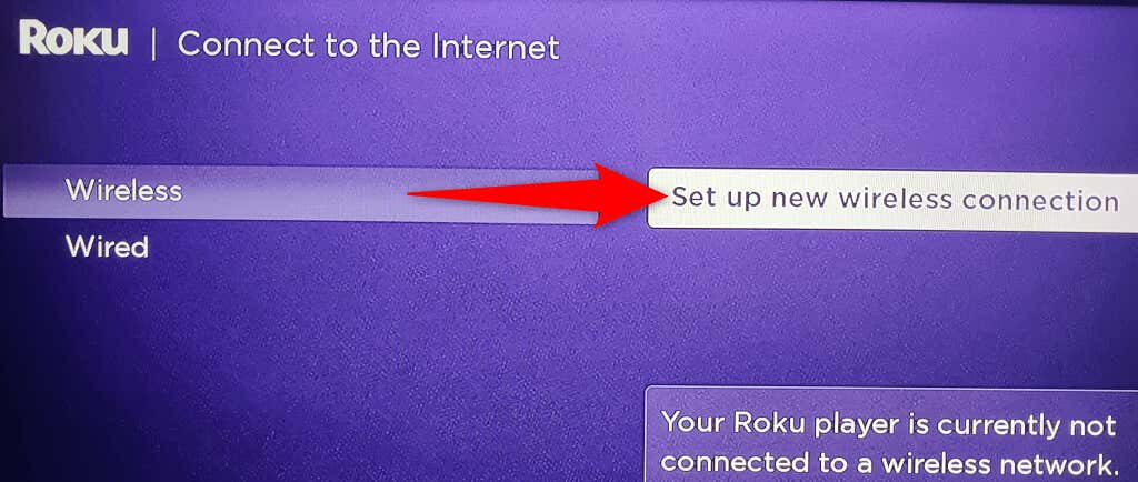 - When Roku asks to connect to a network, choose Wireless > Set up new wireless connection. Don’t select Wired as you want to connect your device to a Wi-Fi network.