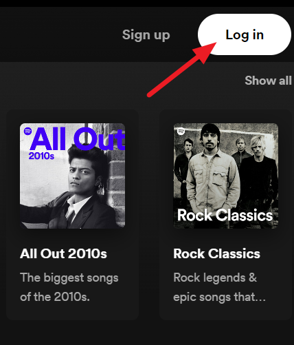 - Select Log In at the top-right corner of the Spotify site.