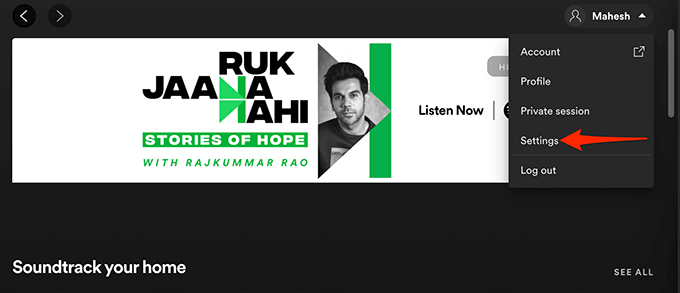 - In the Spotify desktop app, at the top, select the down-arrow icon next to your profile name and select Settings.