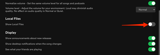 To fix this, launch the Spotify app, head into Settings, scroll to the Local Files section, and ensure the toggle next to your music folder is turned on.