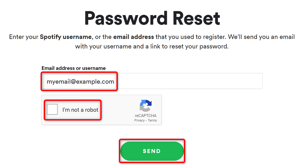 - Select the Email address or username field and type your Spotify email address or username. Then, confirm the captcha and select Send.