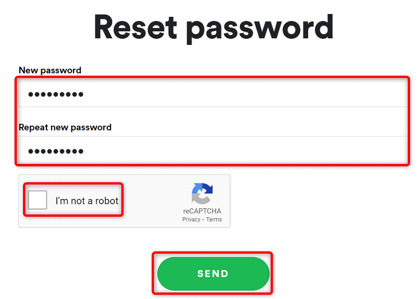 - Choose the New password field and type the new password to use with your Spotify account. Enter the same password in the Repeat new password field. Then, confirm the captcha and select Send.