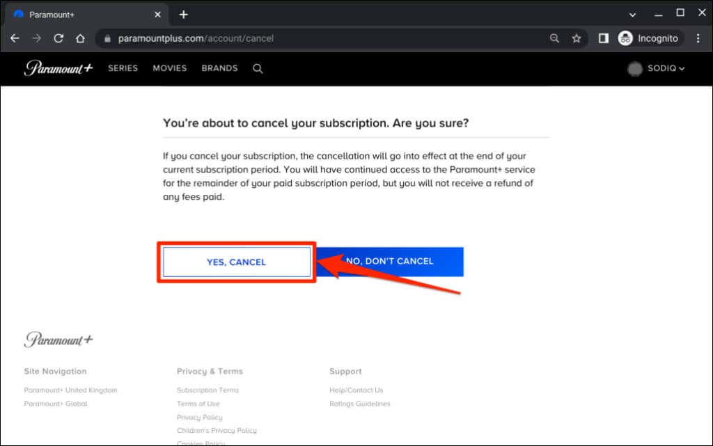 Cancel Paramount+ on PC Web Browsers