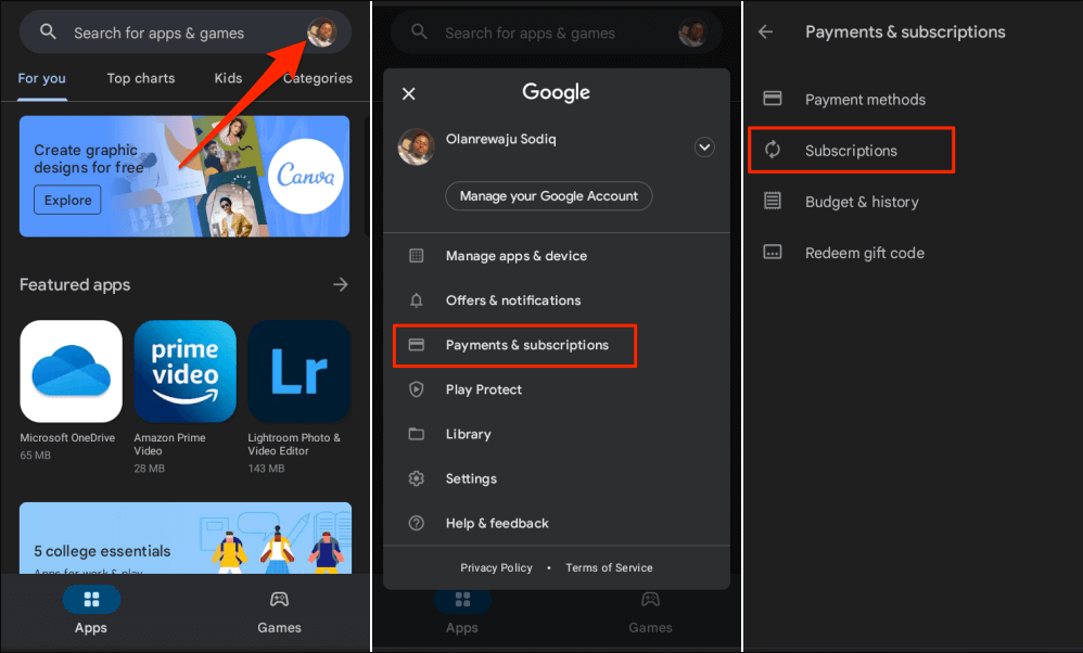 - Open the Play Store app and select your profile picture in the top-right corner.
