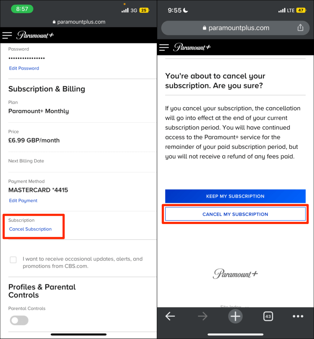 Cancel Paramount+ on Mobile Web Browsers