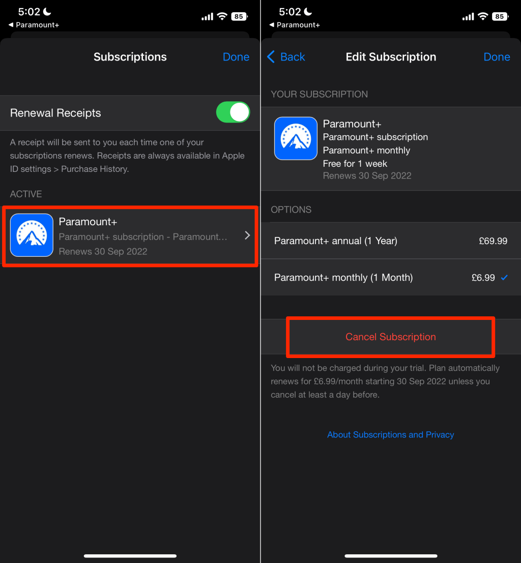 - Select Paramount+ and tap Cancel subscription.