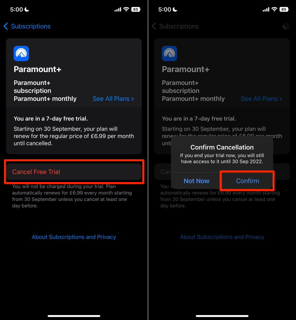 - Tap Cancel Subscription (or Cancel Free Trial) and select Confirm to cancel the subscription.
