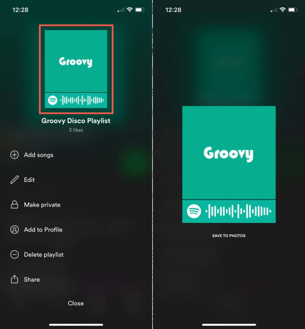 Another option for sharing your playlist is to create a Spotify Code. A Spotify Code is an image that contains the Spotify logo and a sound wave. When you send or share the image, your friend simply scans the code to open your playlist.