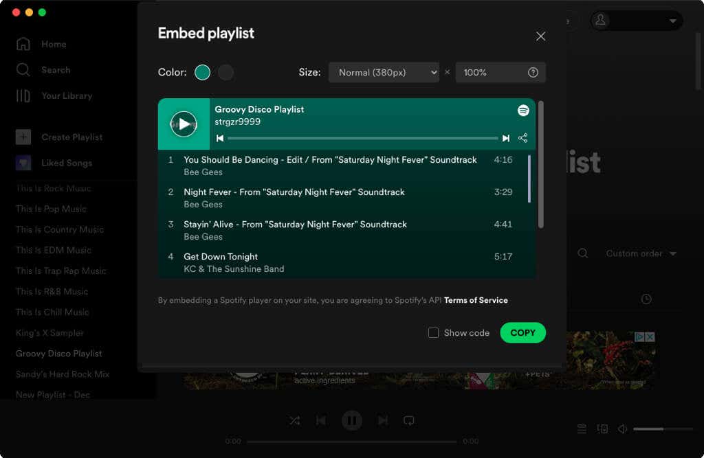 - Embed playlist: This creates code for you to embed on your blog or website. You can choose the color and customize the size for the player. When you’re ready, select Copy to place the code on your clipboard and paste it on your site where needed.