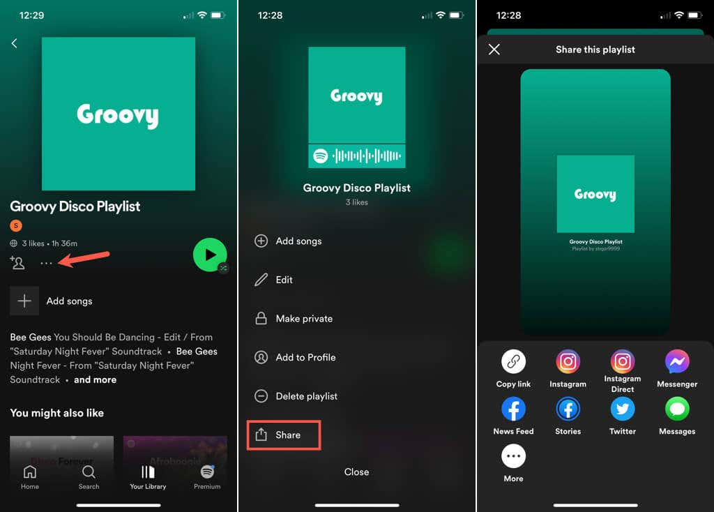 - Tap the three dots on the playlist detail screen and select Share near the bottom of the screen.
