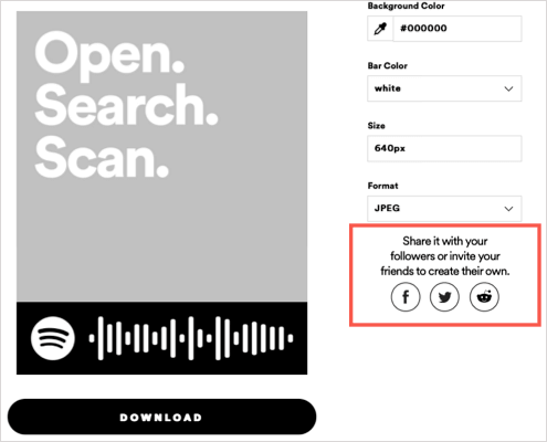 - Alternatively, you can pick a social media sharing option on the right. Post your Spotify Code on Facebook, Twitter, or Reddit.