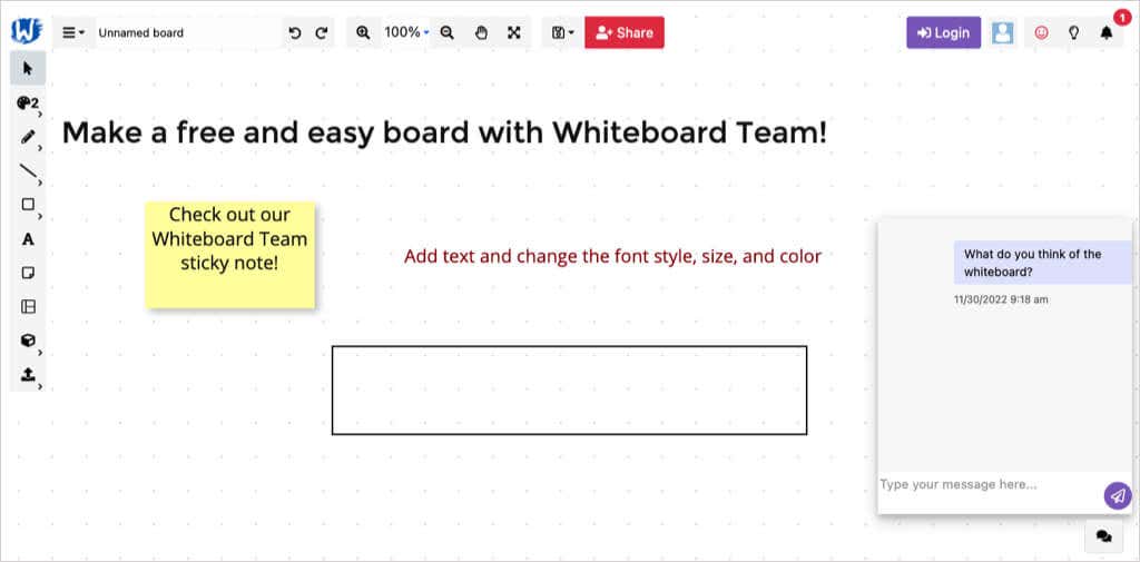 For a hassle-free way to capture and share ideas, give Whiteboard Team a try. This online whiteboard tool stays free and doesn’t require an account. This makes it ideal for a quick brainstorming session with collaborators using the in-app messaging feature.