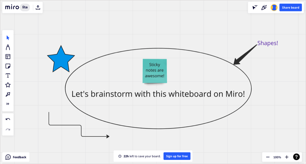 Miro is one of the most popular and full-featured online whiteboards. You get the exact tools you need with a pen, highlighter, and eraser plus sticky notes, shapes, text boxes, lines, and arrows. However, Miro goes the extra mile with its standout features.