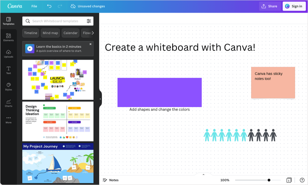 You may have used Canva for creating invitations, infographics, or social media banners. Canva also offers an online whiteboard that you can use with or without an account.