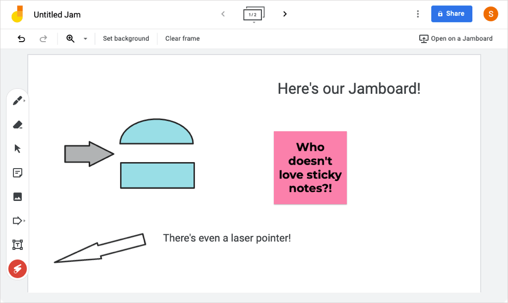 While Google Jamboard may not have as many bonus features as the other whiteboards on this list, it is a convenient option. If you use the Google Meet whiteboard feature, Jamboard is the tool you’ll see. Plus, your boards are saved automatically with your Google account and accessible via the Jamboard site or Google Drive.