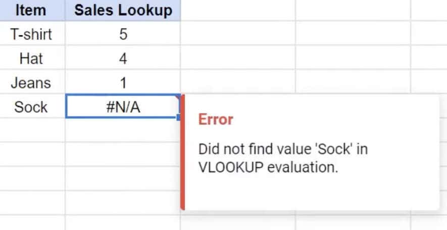 How to fix it: This error message tells you that the value you’re looking for is unavailable. This is most common when you’re using lookup functions like VLOOKUP, HLOOKUP, QUERY, INDEX, or MATCH.