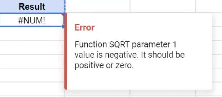 Simply speaking, this error occurs when your formula contains an invalid number. This number might be too large to be displayed within the scope of Google Sheets, or this number may be invalid because it’s not the type of number the syntax calls for (for example, you put a decimal number in a place where a whole number is required). One classic example is trying to find the square root of a negative number, which isn’t allowed.
