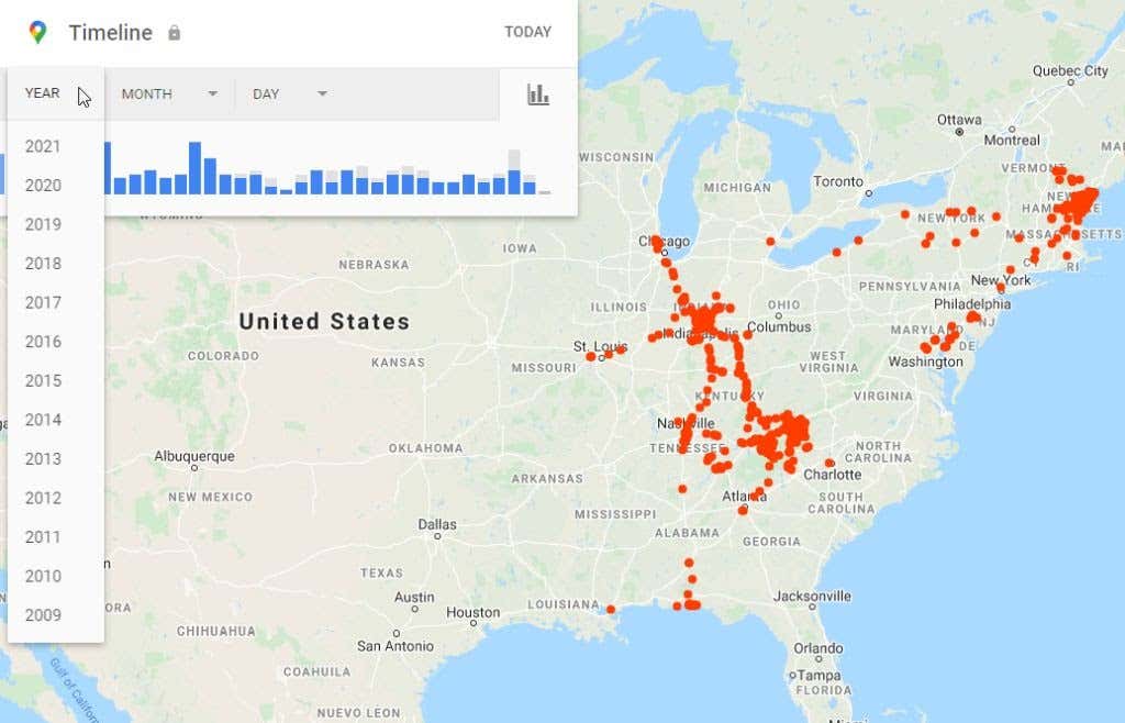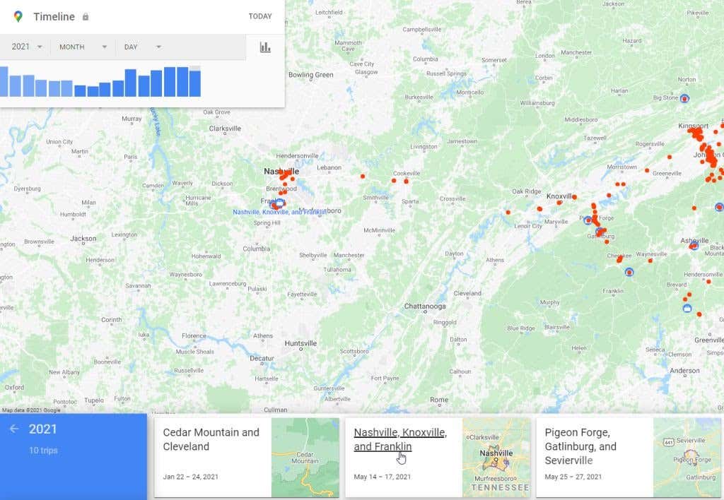This will produce a list of trips you took during that year. You can even use the Month and Day dropdowns to focus more on the timeframe of your visit. Or just select the day from the list of vertical blue bars if you know exactly what day you visited that location.