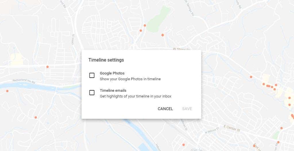 In your Location History window, select the gear icon at the bottom of the map. Select Timeline settings from the popup menu.