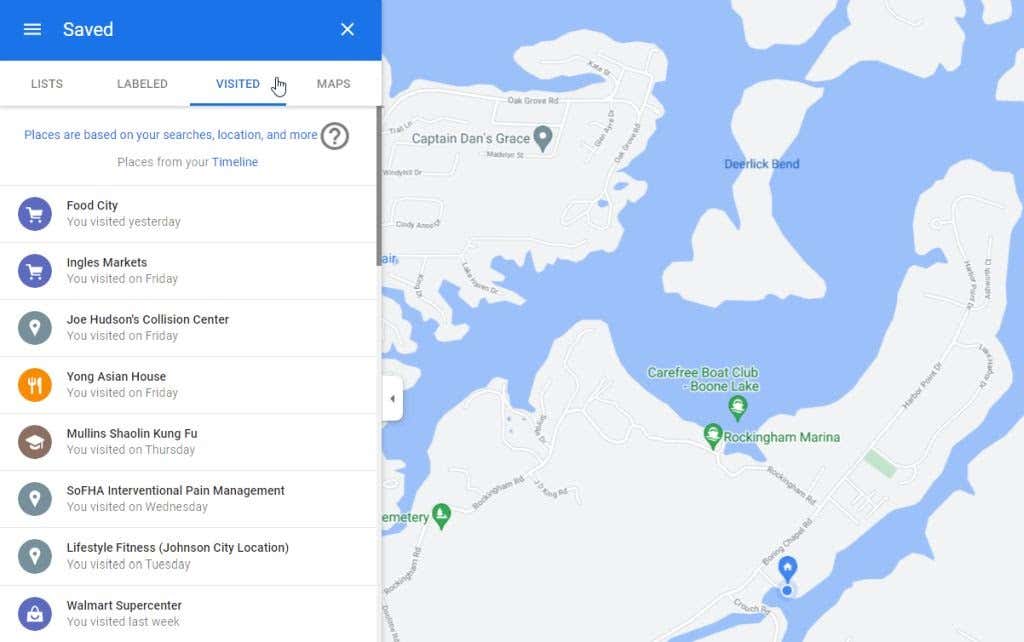 The Visited tab will show you a quick list of the most recent places you’ve visited. These are the same locations logged to your Google Location History.