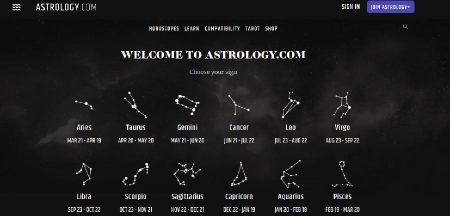 The first and foremost best horoscope site on our list is astrology.com. The website offers a free daily horoscope for all the star signs, which you can pick with the night-sky-like surface.