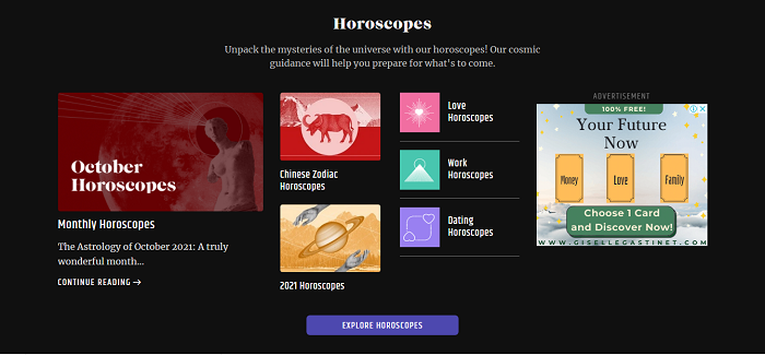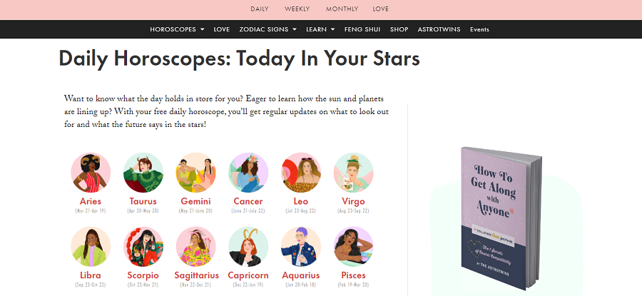 Here, you can get horoscopes in a bite-size format that makes you feel like you’re reading a column in their magazine. It can be pretty useful when you’re on the go or want to get a quick scan or read on how things will turn out straight away.