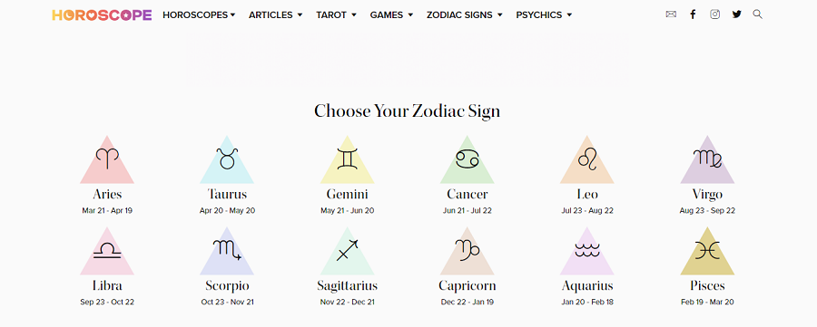 Horoscope.com provides the same experience as Astrology.com, but instead of a black screen, you can easily see your star signs in nice pastel color schemes.