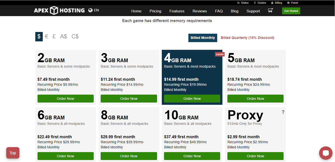 Furthermore, this Minecraft server hosting company has a 24/7 live customer support chat tool. Apex Hosting offers one-click installation of 150 modpacks, including SkyFactory, Pixelmon, and RLCraft. If you are low on budget, you start with their 512 MB Proxy server at just $2.99 per month.