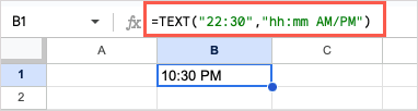 As an example, we’ll format the time 22:30 in a 12-hour format with AM or PM and as text using this formula: