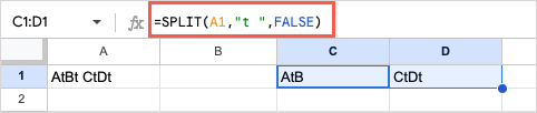 =SPLIT(A1,”t “,FALSE)