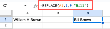 Here, we want to replace “William H Brown” with “Bill Brown,” so we’ll use the REPLACE function and this formula: