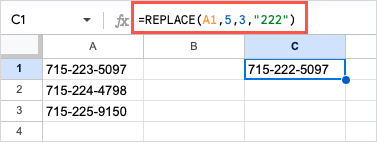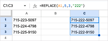 As another example, we have phone numbers stored as text and need to change the prefix for each. Since each prefix is different, we can use REPLACE to specify the position and number of characters for the replacement. Here’s the formula: