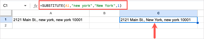 To break down this formula, A1 contains the text, “new york” is the text we search for, “New York” is the replacement, and 1 is the first occurrence of the text.