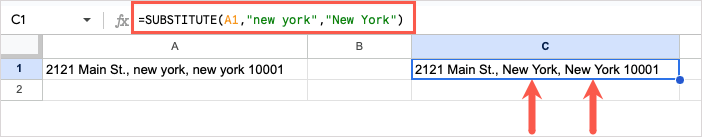For an example of the SUBSTITUTE function, we want to replace “new york” with “New York” and will add the occurrence argument to make sure we only change the first instance in our string. Here’s the formula: