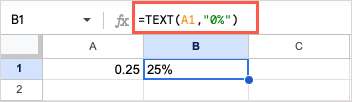 For another example, we’ll format the number in cell A1 as text with a percent sign using this formula: