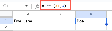 For an example of the LEFT function, we’ll extract the first three characters from the left using the text in cell A1 with this formula: