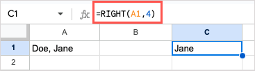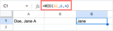 For an example of the MID function, we’ll extract the name “Jane” from the text in the same cell.