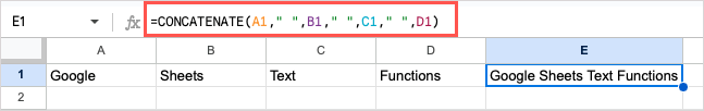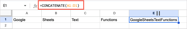 In this example, we’ll combine the text in cells A1 through D1 into a single string with this formula: