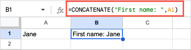 For another example, we’ll combine the text “First name: ” with the text in cell A1 with this formula: