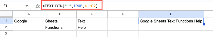 As an example, we’ll join the text in the cell range A1 through C2 with a space as the delimiter and TRUE to ignore the empty cell (A2). Here’s the formula: