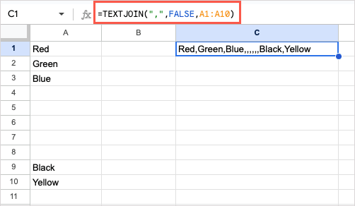 For another example, we’ll combine the text in cells A1 through A10 with a comma as the delimiter and FALSE to include the empty cells (A4 through A8) so you can see how the result looks. Here’s the formula: