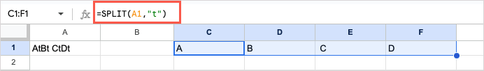 For another example, we’ll split the text in cell A1 using “t” as the delimiter. This removes the “t” like it removes the space delimiter above and leaves the rest of the text. Here’s the formula: