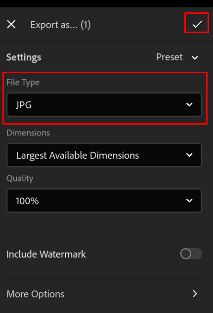 - Choose JPG file type, and change other settings if needed. You can rename the photo in the More options section. Once you are done, tap the check mark at the top right corner of the screen.